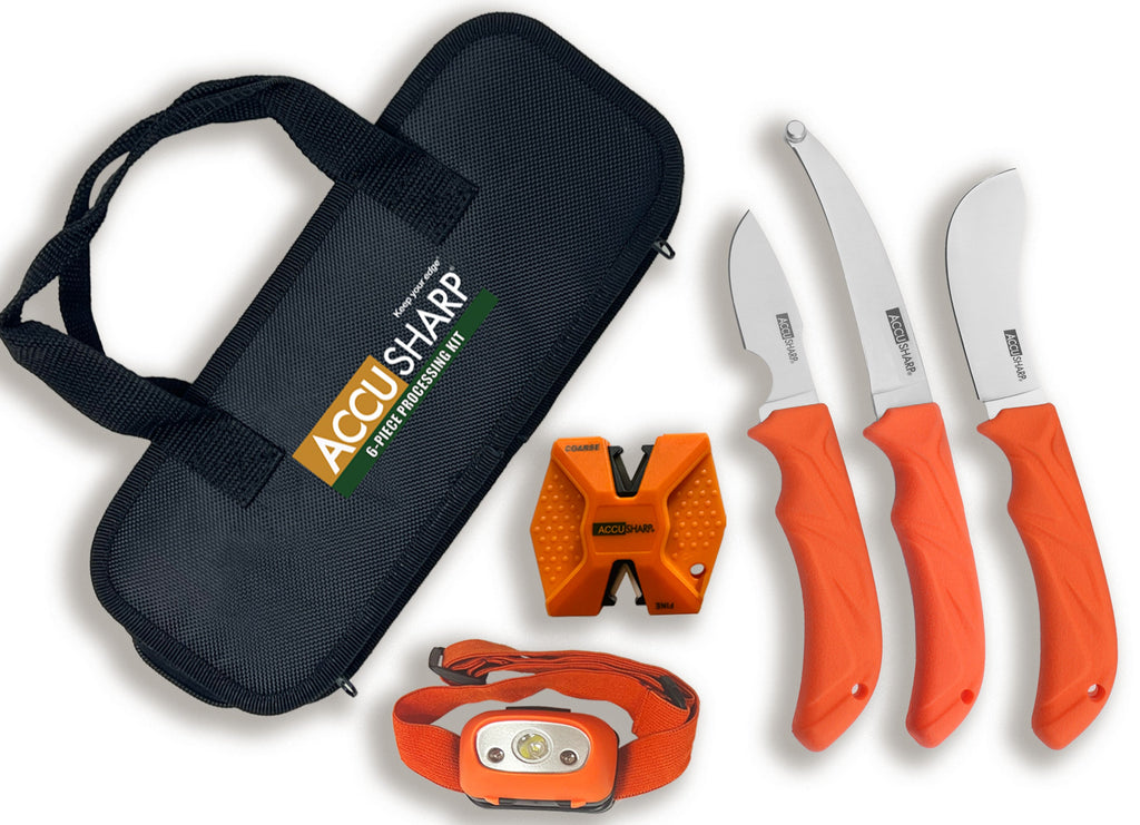 Model/Item/Part Number - AS738C. AccuSharp Six Piece Processing Kit. Satin finish 420 stainless blade. Orange rubber handle. Includes: 8.5" overall guthook with 4" round tip blade; 9" overall butcher knife with 4.25" blade; 8.25" overall caping with 3.5" blade; 2-step carbide-ceramic knife sharpener; 4-mode LED head lamp with (3) AAA batteries. Zippered storage case. Made in China.