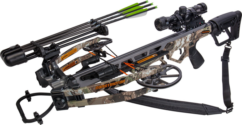 Perfect for crossbow hunters in tight quarters, the Constrictor’s narrow dimensions and blazing speeds of 410 fps deliver lethal results without draining your wallet. Living up to its name, the Constrictor measures a mere 10” wide cocked and 14” wide uncocked. The ambidextrous top mount 5-arrow quiver sits on a 360-degree pivot allowing the hunter to position the quiver on the right- or left-hand side of the crossbow and parallel to the bow. Premium finishes including the adjustable cheek pad, anti-dry fire device, and 3” of trigger pull adjustment complete this crossbow package. The Constrictor comes ready to hunt with 3 Bear X TrueX arrows, top mount 5-arrow quiver, illuminated scope, sling, cocking rope, and rail lube / string wax.