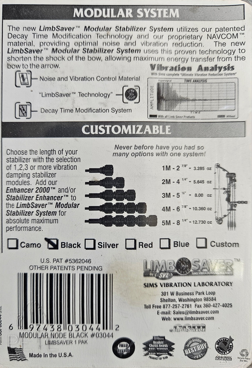The LimbSaver Modular Stabilizer System in unlike any stabilizer seen in the archery industry today. Extremely efficient at reducing noise, vibration and bow jump, this best in its class versatile system with a stem of three modules. Adaptable to fit your particular shooting style. Use 1, 2, or all 3 modules, or add extra modules (sold separately) to suit your game.  Stabilizers are offered in Black and anodized Camo.